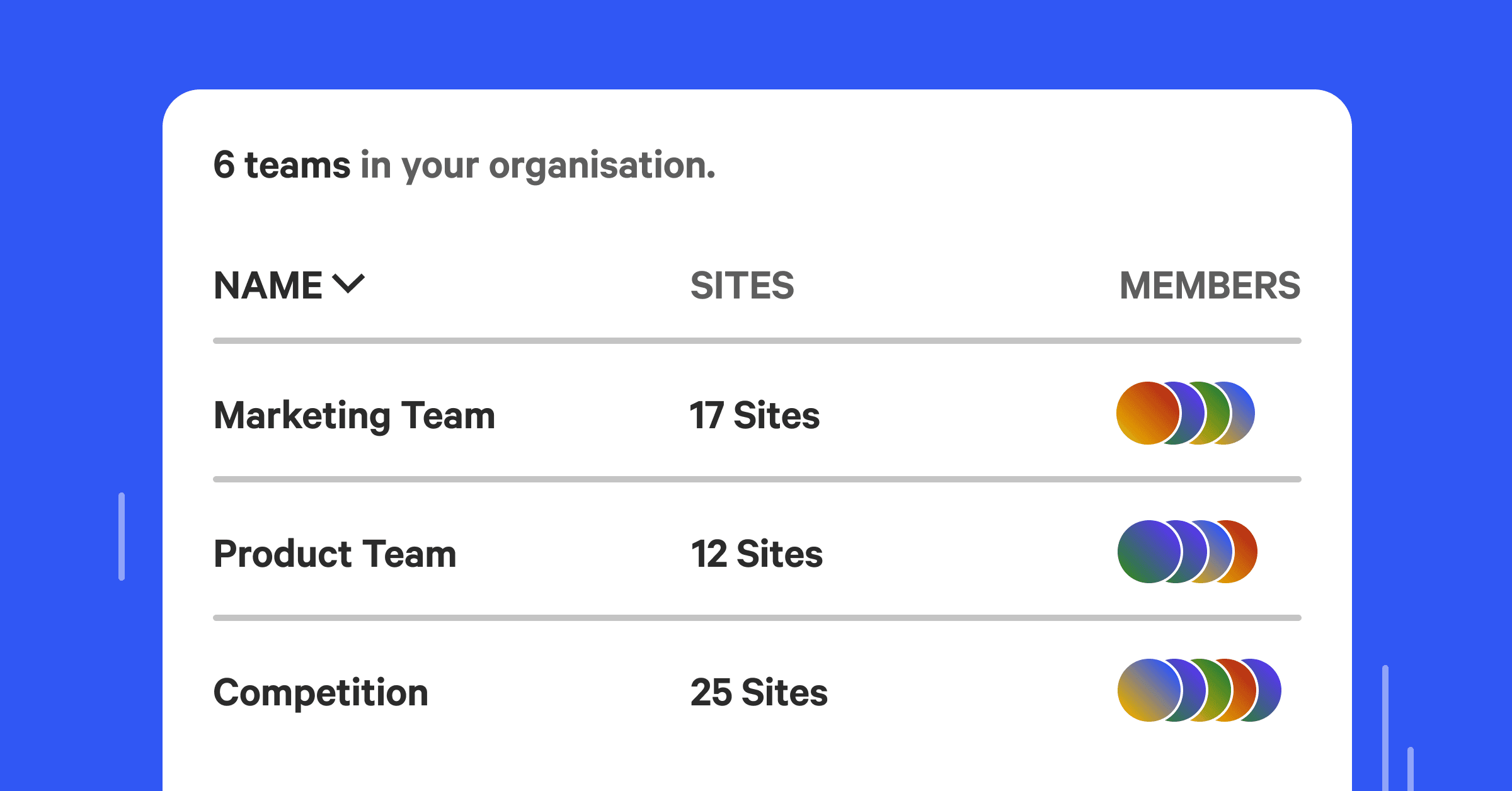 There’s no one way to use Teams, similarly like there are no two identical companies. Administrators can create unlimited Teams on any plan above Starter in a way that makes the most sense—based on departments, projects, clients or another unique structure. You can move already monitored Sites to new Teams in just a few clicks.